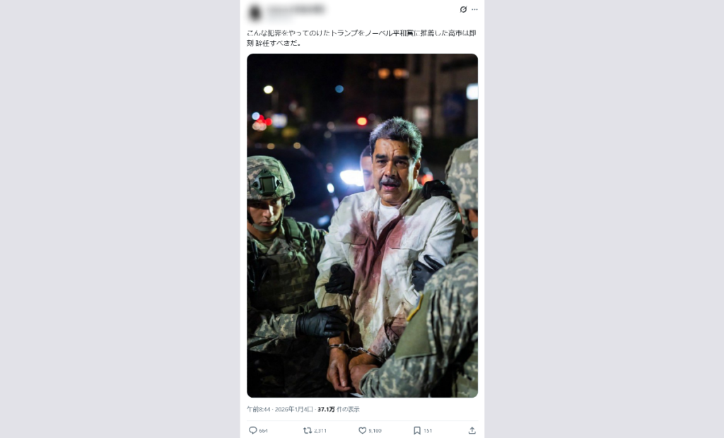 マドゥロ氏の拘束時の様子として、AI生成と思われる画像が複数拡散されている。この血で汚れた服を着たマドゥロ氏の画像もその一つだ。