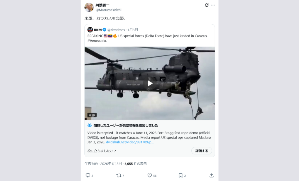 2026年1月3日、アメリカはベネズエラに軍事攻撃を行い、同国のニコラス・マドゥロ大統領を拘束した。本記事では前回に引き続きこの件に関する誤った情報や誤解を招く情報をピックアップすると同時に、関連情報を紹介する。