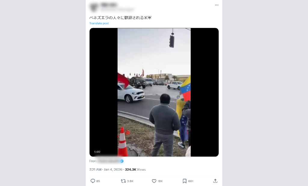 ベネズエラ国旗を振る人たちの前を軍用車両が通過する動画。投稿日はマドゥロ氏拘束の翌日であり、関連動画との誤解を招いているが、実際には1年程前の動画である。
