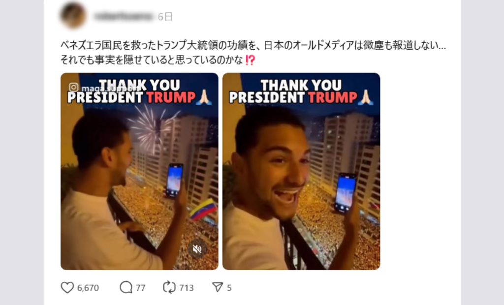 前回の記事でも述べたように、拡散されている誤情報・要注意情報には、「マドゥロ氏の拘束にベネズエラの市民が歓喜している」という内容のものが特に多い。ベネズエラ国外では各地で喜ぶ群衆の姿が見られ(参照)、国内でも一定数が拘束を支持しているのは事実だ。しかし、国内での反応は当局による抑圧もあって比較的小さく、大勢の市民が集まって歓喜するような様子は伝えられていない(参照12)。