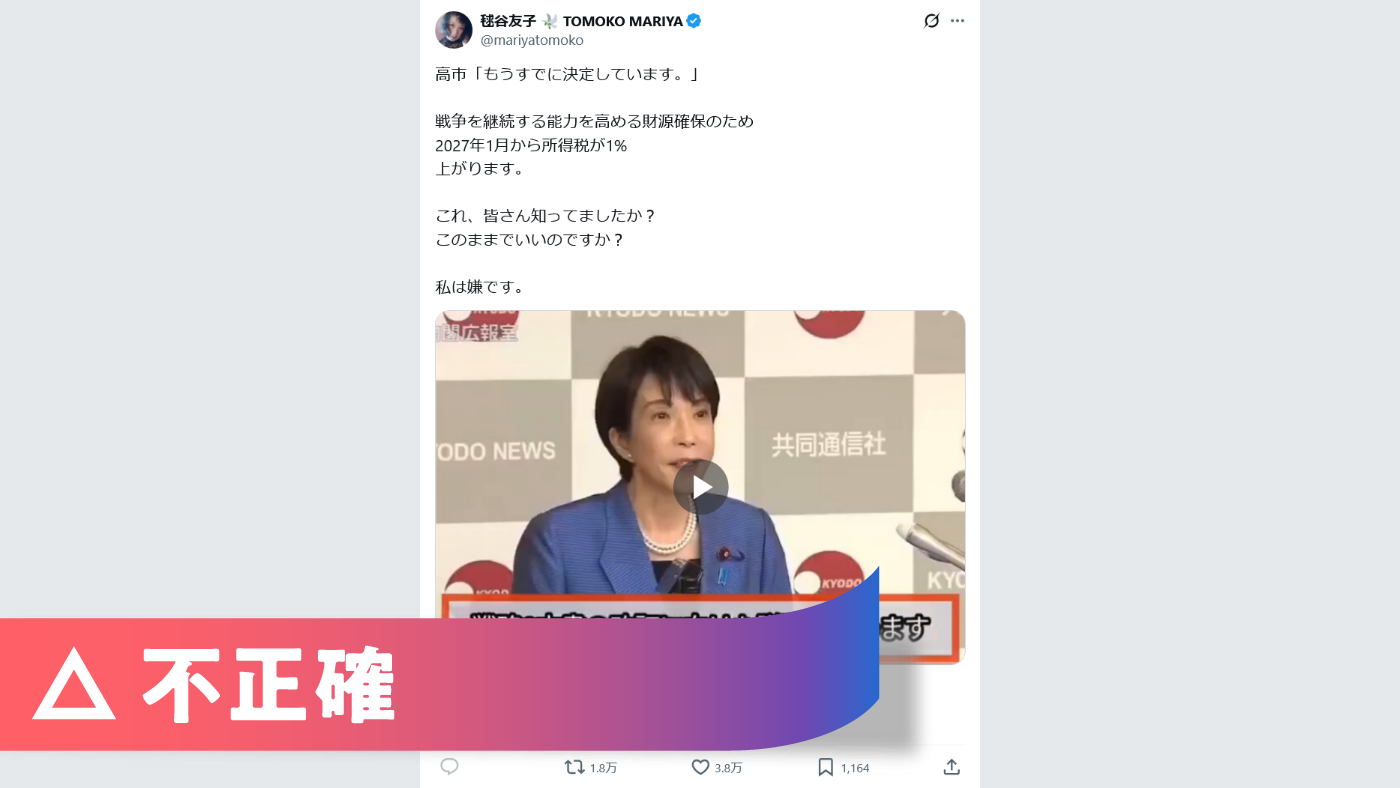 検証対象のX投稿は俳優の毬谷友子氏によるもので、別のユーザーが投稿した高市早苗首相の会見動画を引用し、「戦争を継続する能力を高める財源確保のため2027年1月から所得税が1%上がります」などと述べている。