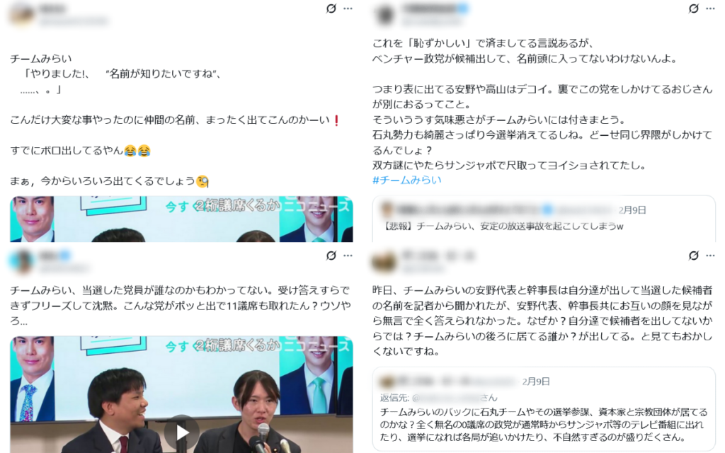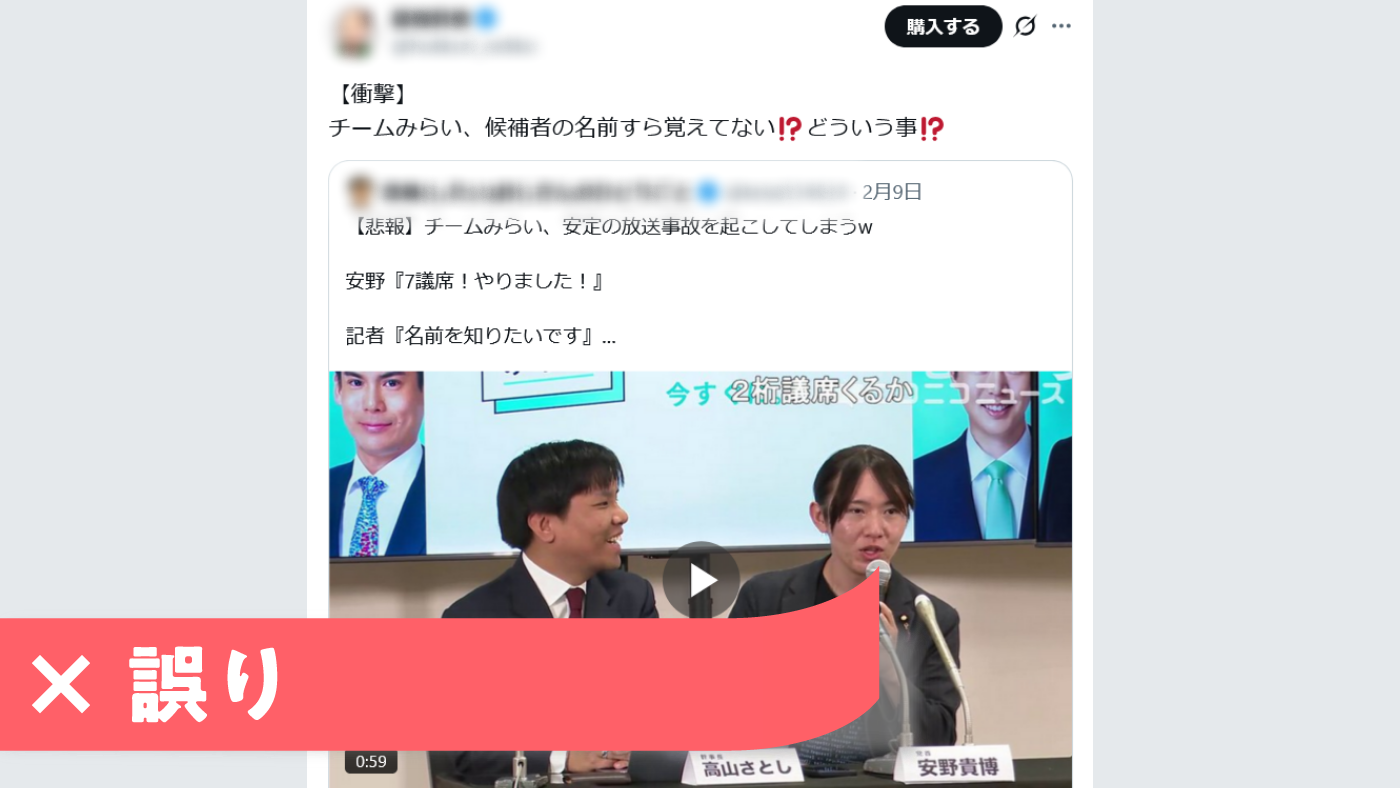 検証対象の投稿は、この動画を基に、安野氏らが当選した自党の候補者の名前を覚えていないと批判している。同様の投稿は他にも拡散されており、数千リポストを獲得したものも複数ある。