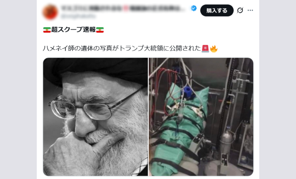 ハメネイ師の遺体を写したものとして拡散された、覆面をして拘束された状態で横たわる人物の画像(上図右)。