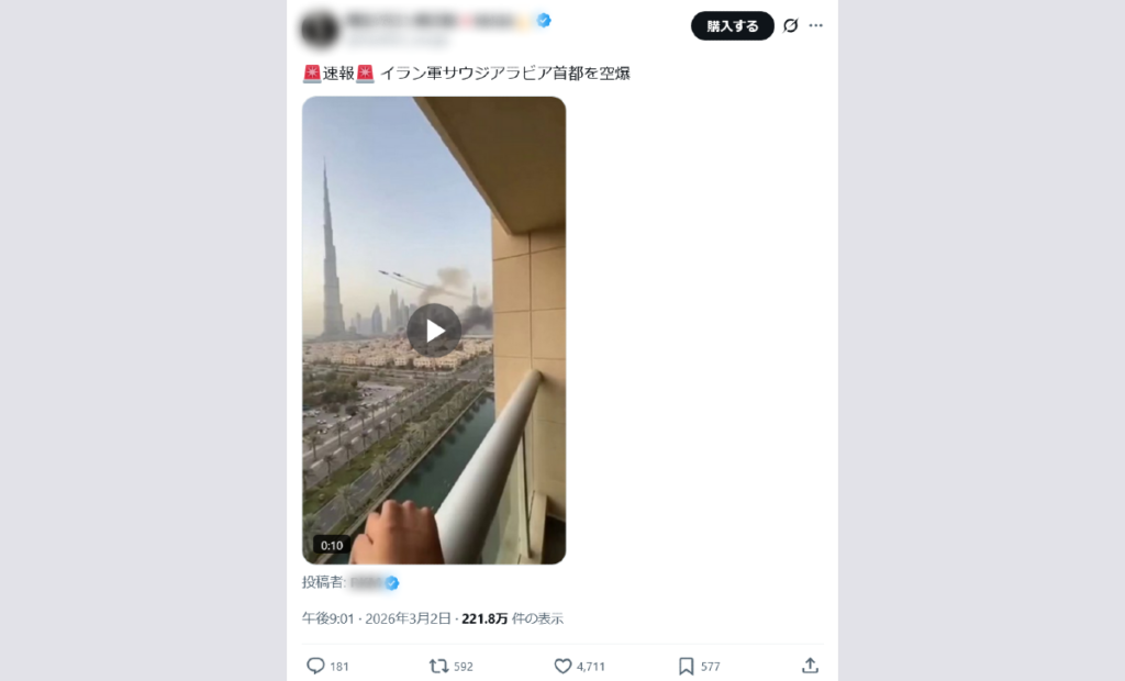 イラン軍によるサウジアラビア首都・リヤドへの攻撃とされる動画だが、手前に映る手の形がおかしいことなどから、AI生成動画の可能性が高い。