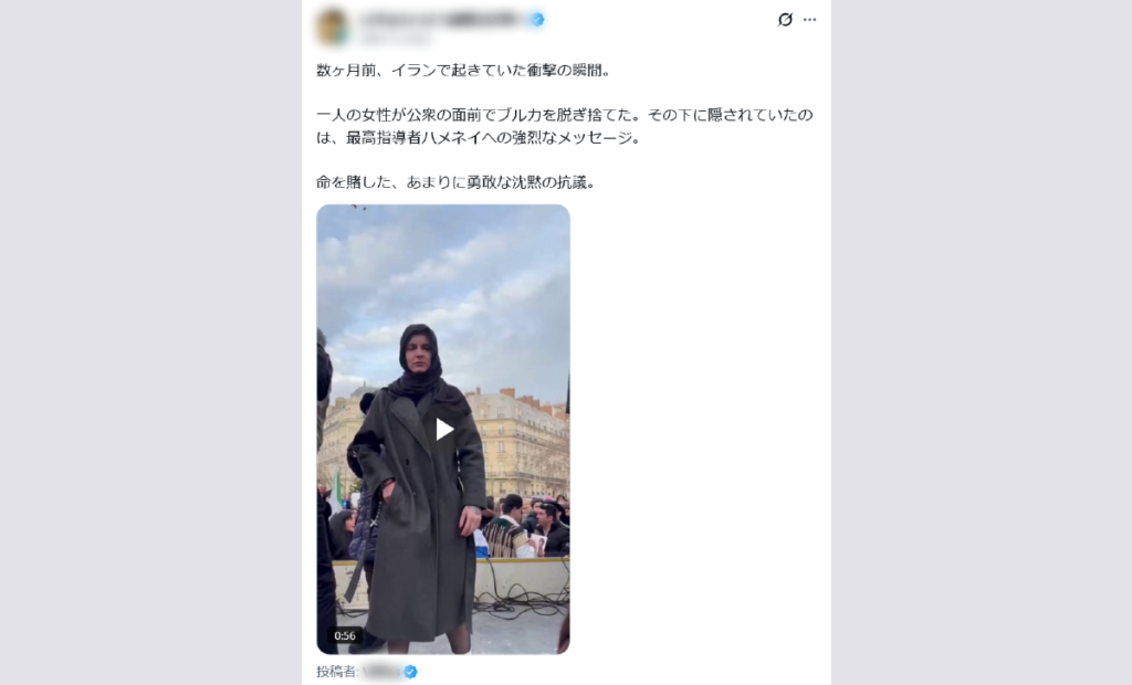 これは2026年1月、右派団体に所属するフランス人の活動家がパリで行ったパフォーマンスで、イランで起きたことではない。また、XやInstagramの投稿などを見る限り、この活動家は以前からブルカを着用しておらず、イスラム教徒であることをうかがわせる様子は無い。