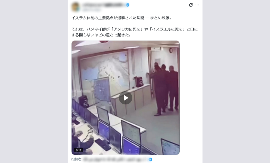 同様の動画は2025年12月には既に海外で拡散され、複数のファクトチェック記事が公開されている。それによれば、4つのシーンのうち3つはAIで生成された動画とみられる。各シーンには、壁面に掲げられた中東らしき地図の地形が現実と異なる、人の指や机上の物体の形がおかしい、デジタル時計の表示がおかしい(ただし、この部分は上掲のX投稿動画では削除され映っていない)といった奇妙な点が複数指摘されている。