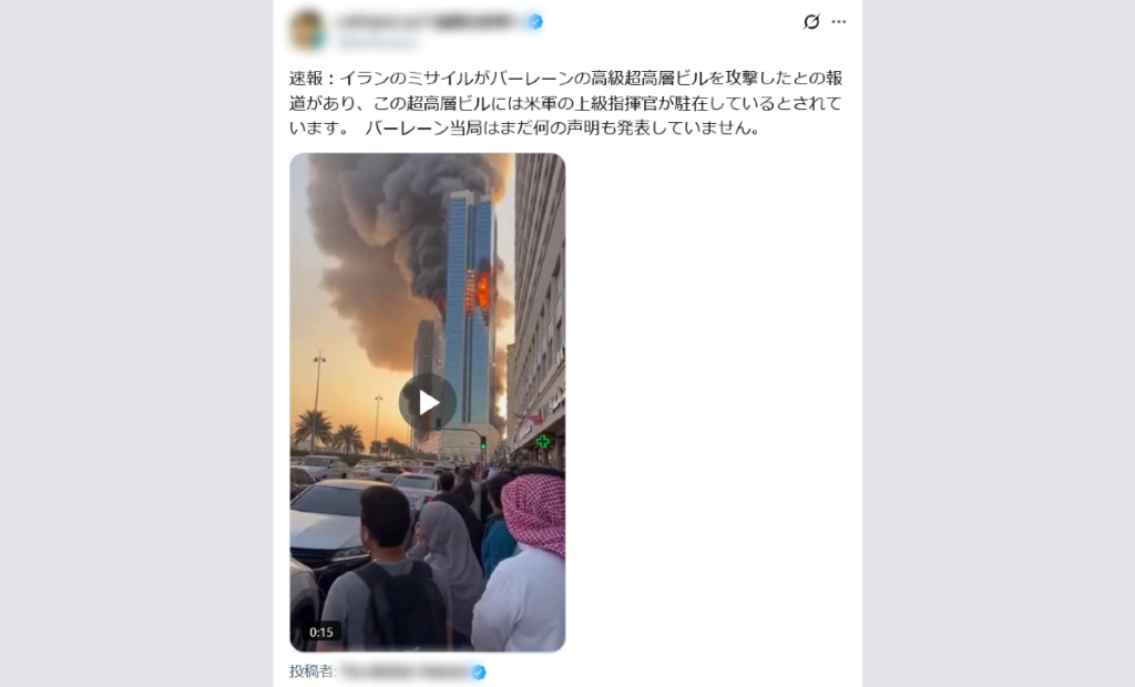 バーレーンの首都マナマでは、高層マンションがイランのドローン攻撃の被害を受けている(参照)が、拡散された動画はこれとは無関係だ。また、このマンションにアメリカ軍指揮官が駐在しているという情報は確認できない。