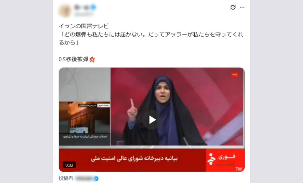 これは2025年6月、イラン国営のイラン・イスラム共和国放送(IRIB)が、傘下のニュースチャンネル(IRINN)の生放送中にイスラエルによって攻撃された時の映像であり、今回(2026年2月~)の攻撃とは関係が無い。また、AFP通信やTBSによれば、この時アナウンサーは放送局への攻撃を伝えながらイスラエルを非難する発言をしていたのであり、「アッラーが私たちを守ってくれる」といったことは言っていない。
