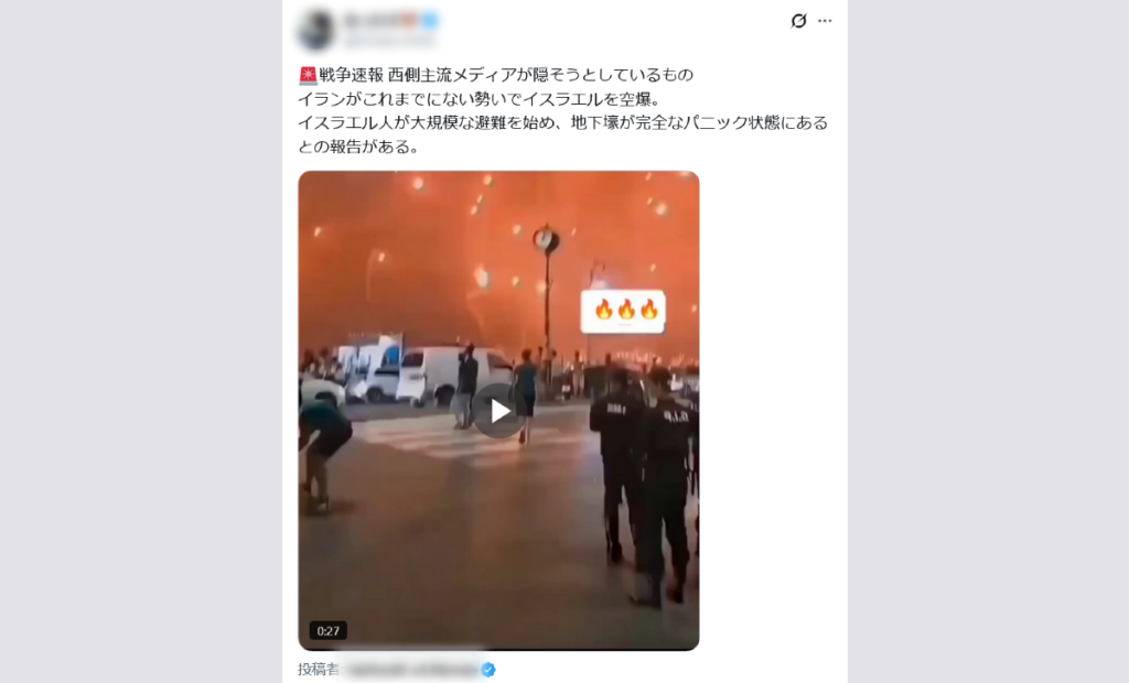 背景のアラビア語の文字の乱れなどから、イラン国営メディアSNNの動画を基にAIで加工した動画と考えられる。