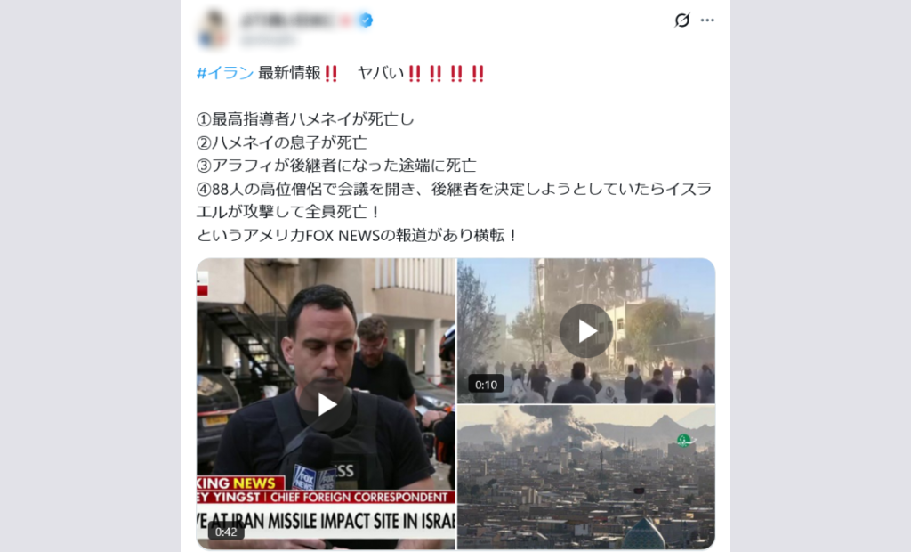 しかし、アリ・ハメネイ師の息子、アラフィ師、専門家会議メンバーの死亡や、アラフィ師の最高指導者就任を、FOXニュースが報道した事実はいずれも確認できない。アリ・ハメネイ師が死亡した際の攻撃では孫などの親族も死亡したとされる(参照。妻は当初死亡と発表されていたがその後生存と修正)が、息子が死亡したという情報は無い。また、投稿の添付動画の1つは専門家会議への攻撃を伝えるものだが、会議メンバーは攻撃前に避難済みだったとされており(参照)、死亡したという報道はされていない。