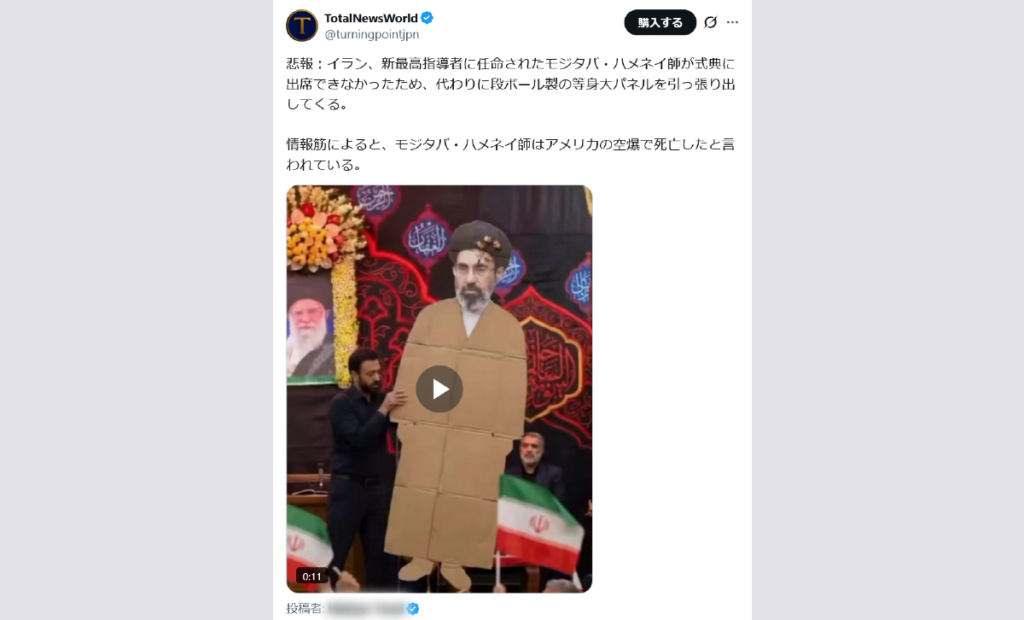 まとめサイト「Total News World」のXアカウントによる投稿。海外ユーザーの投稿動画を引用し、式典に出席できなかったモジタバ・ハメネイ師の代わりに段ボール製のパネルが使われたと述べている。